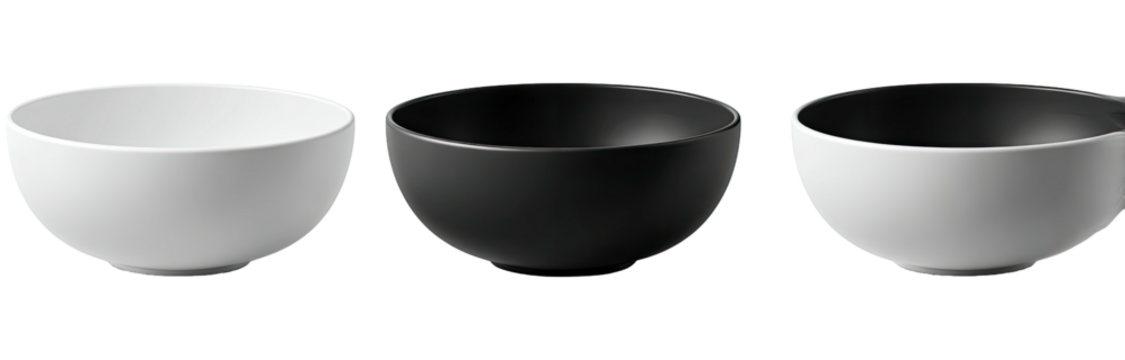 Three minimalist ceramic bowls in varying shades, arranged side by side against a black background