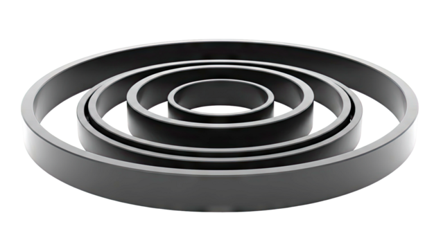 A close-up view presents an arrangement of numerous circular forms, varying in size and metallic finish. The circles are gold, black, and gray