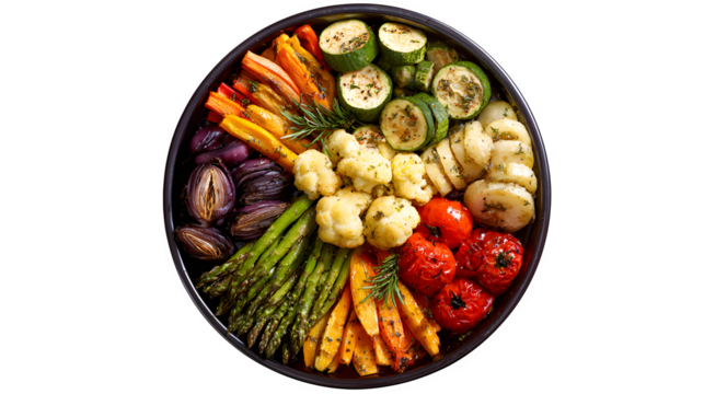Creative platter of prepped roasted vegetables in circle design, isolated on Transparent Background