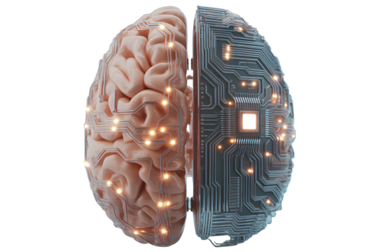 3D Human Brain Integrated with Circuit Board, Front View, AI Concept