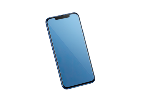 A Sleek Blue Smartphone Displaying a Mirrored Surface With a Subtle Geometric Pattern Isolated on a Black Background With RGB Glitches Along the Edges Representing Digital Technology and Connectivity