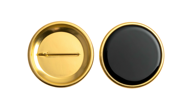 Two circular badges one golden back with pin, other shiny black front with gold rim