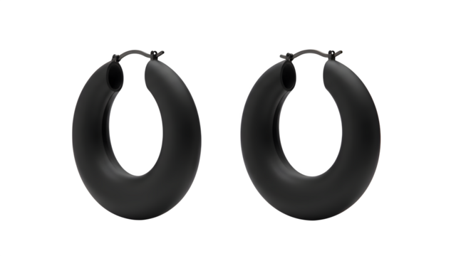 Matte black, rounded hoop earrings sit against a stark background. Ideal for jewelry ads, style blogs, or accessories product photography.