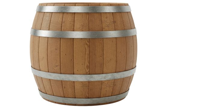Isolated wooden barrel with metal hoops for wine aging and storage on white background studio shot on transparent background