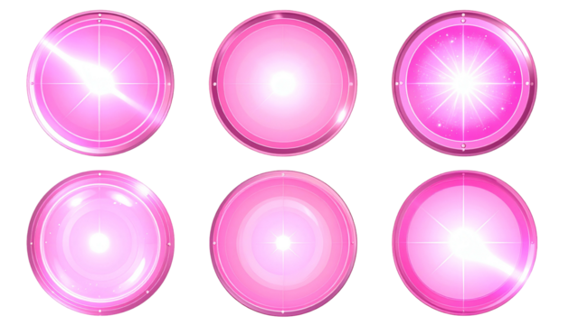 Six circular objects, varying pink gradients and white light flares, set against a black backdrop