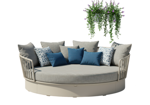 Modern circular outdoor daybed with blue and patterned pillows isolated on transparent background