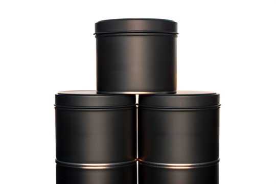 Stack of three dark, round metal tins with lids, isolated on a white background