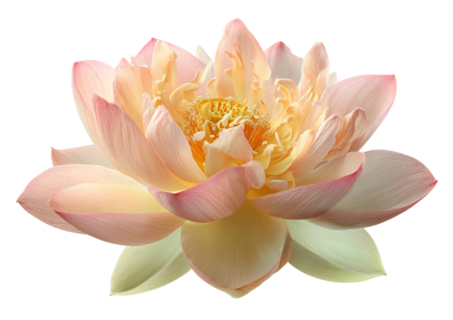 Close-up of a blooming, layered aquatic flower with soft pink and yellow hues