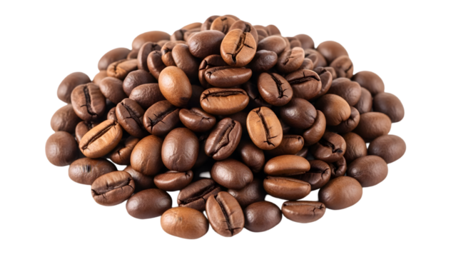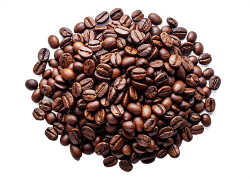 A pile of roasted coffee beans forming a circular shape isolated on transparent background