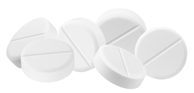 stack of numerous white round medical pills with a clear scored line, forming a pile for pharmaceutical concepts.