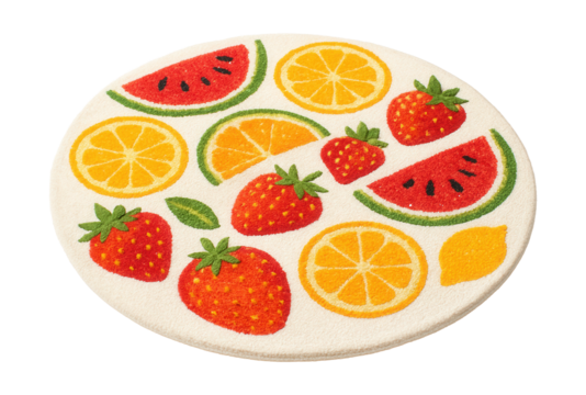 A round cotton kitchen rug featuring a bright fruit design, perfect for adding color to