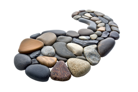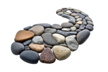 Curving line of smooth river stones isolated on transparent background. Curved river stone path design for tranquil garden landscaping isolated on white background.