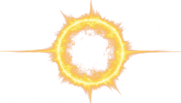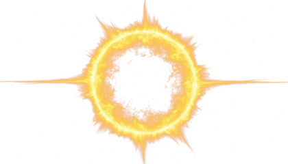 Glowing circle with rays and burning golden edges on transparent PNG clipart for design.