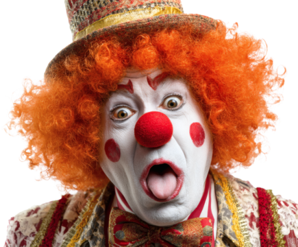 Surprised clown with red nose and orange hair