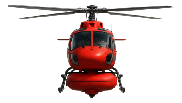 Compact firefighting helicopter with a water tank and reinforced rotor blades.