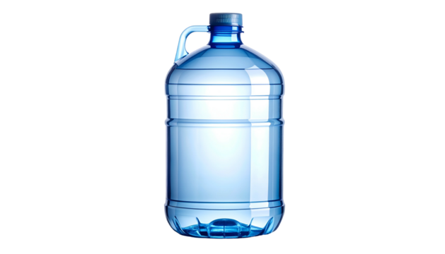A transparent, large, plastic water container with a blue cap and a handle for easy carrying, presented on a black background
