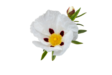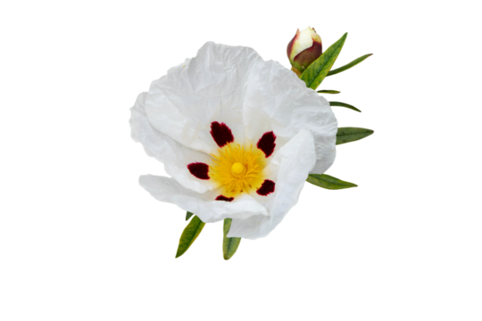 Delicate white rockrose flower with green buds and leaves isolated on transparent background