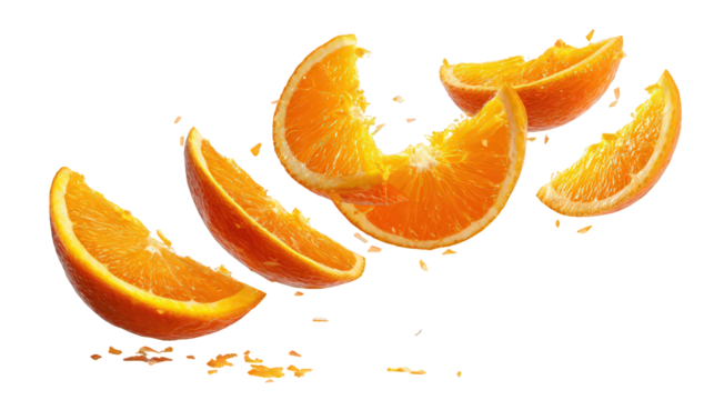 set of floated slices of orange falling isolate on withe background with fruit, fresh, isolated, citrous, food, orange, slice