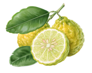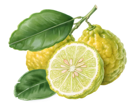Fresh bergamot or kaffir lime fruit with cut in half slice and green leaf isolated  top view  transparent.