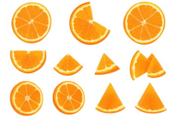 A collection of orange citrus fruit slices arranged aesthetically. various cuts and angles. perfect for food photography. recipes. or health-related content