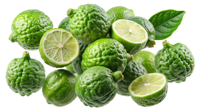 A vibrant collection of fresh green kaffir limes with some sliced in half showcasing their juicy interior isolated on transparent background