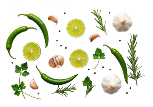 Vibrant fresh ingredients arranged for culinary inspiration spicy peppers citrus and aromatic herbs transparent background