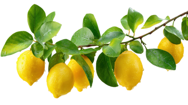 Fresh Lemons on Branch Citrus Tree Green Leaves Water Droplets Vitamin C Rich
