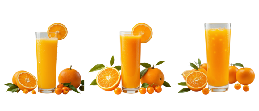 Fresh orange juice with fruit isolated on a transparent background. Refreshing Orange Juice with Oranges and Decorations