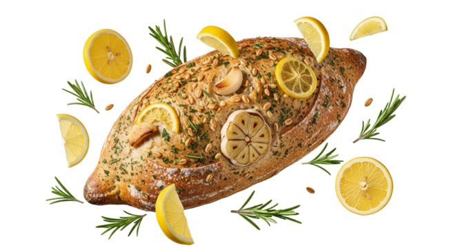 Artisanal Lemon and Garlic Infused Bread with Rosemary Accent Isolated on White Plain Background