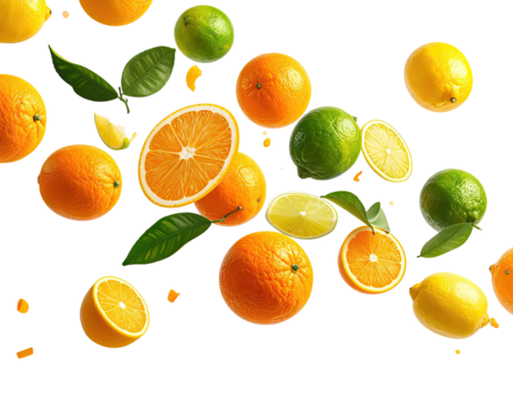 Citrus fruits oranges, lemons, limes, and leaves scattered