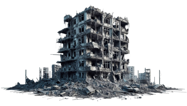 A desolate street view of a city destroyed by war, with ruined buildings isolated on transparent background