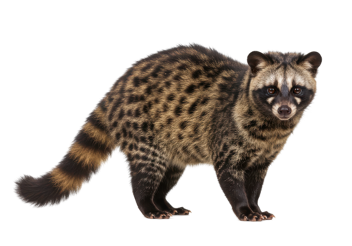 Wild civet cat with spotted fur standing and looking at the camera isolated on a transparent background