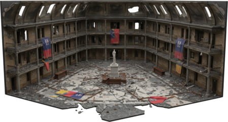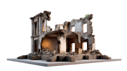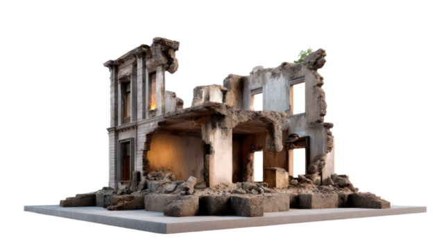 Devastation's Echo: A chillingly realistic depiction of a structure left in ruins after a catastrophic event, capturing the solemn aftermath and the weight of destruction.