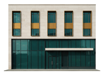 Modern office building facade isolated on white, contemporary architecture with glass windows and stone cladding for commercial real estate design