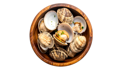 Steamed clams nestled in a dark wooden bowl, isolated on black background