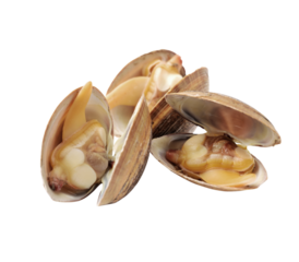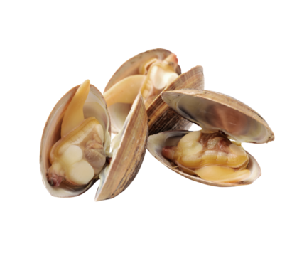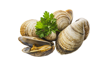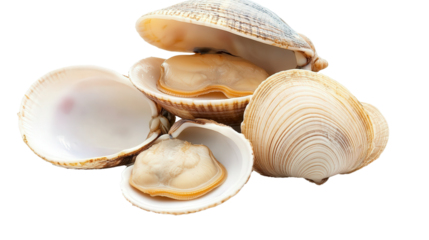Three whole opened fresh clams in shell isolated on white background. Suitable for marketing or business purposes. PNG file