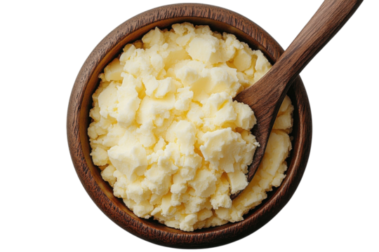 Golden creamy butter or clarified ghee in rustic wooden bowl with spoon on transparent background