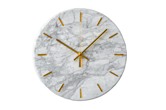 Elegant round wall clock with a white marble face and golden hands.
