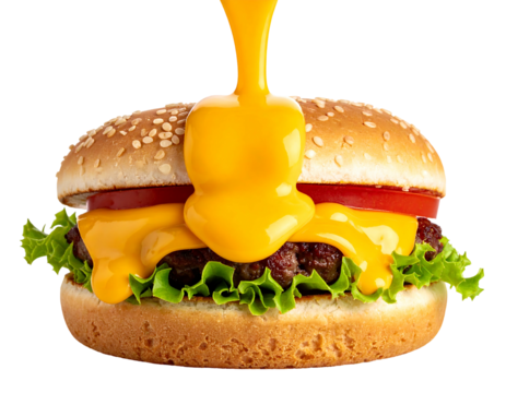 A close-up view of a classic burger. Warm, melted cheese pours over the tomato, lettuce, and patty between sesame seed buns