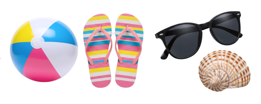 A set of fun beach accessories, featuring a colorful beach ball, striped flip-flops, black sunglasses, and a seashell. This collection represents a classic day of fun and games by the sea.