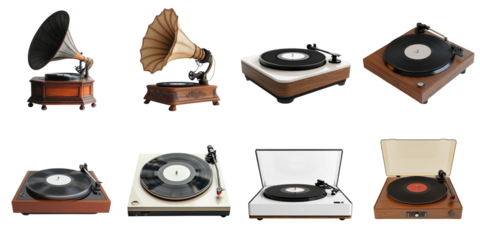 Vintage Record Players: Retro vintage record players with classic vinyl records, isolated on a Transparent background, PNG file.