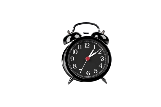 A classic black alarm clock, isolated on a transparent background, shows the time. background removed