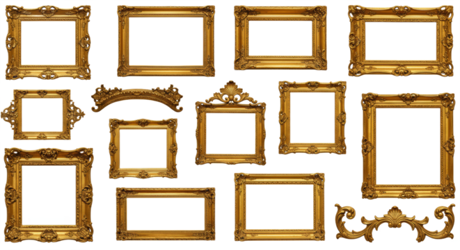Set of old golden mirror and photo frames isolated on white background PNG. Vintage ornate frames, decorative gold frames, antique photo frame collection, classic interior decoration, and elegant