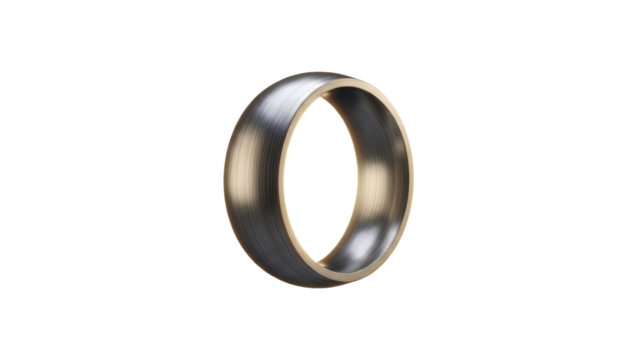 A minimalist brushed metal wedding band or simple ring floats elegantly against a dark, featureless black background.