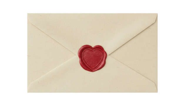 Vintage cream-colored textured paper envelope is sealed with a shiny red wax stamp featuring a romantic heart shape, representing a classic love letter or secret correspondence