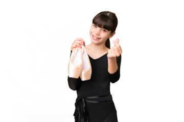 Little caucasian girl practicing ballet over isolated background making money gesture