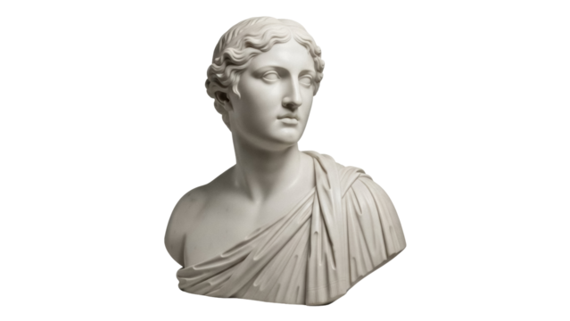 Marble bust of a woman isolated PNG on transparent background, classical sculpture of a female figure for art and design projects