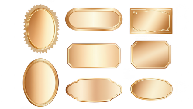 A collection of elegant. golden decorative frames and labels in various shapes and sizes. ideal for enhancing invitations. announcements. or product packaging. set against a clean background
