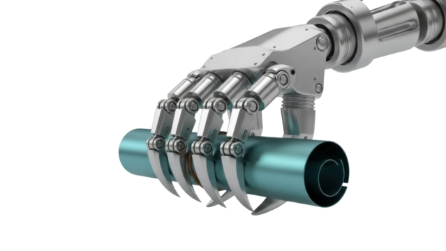 Detailed silver robotic arm with articulated joints and a gripping claw extendable robot arm transparent background