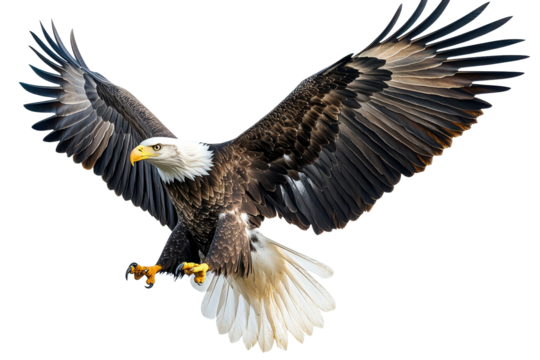 A majestic eagle in a landing pose with wings partially spread, its sharp talons visible, occupying 75 percent of the image on a transparent background